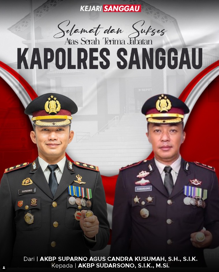Selamat dan sukses atas serah terima jabatan Kapolres Sanggau dari AKBP Suparno Agus Candra Kusumah, S.H., S.I.K. kepada AKBP Sudarsono, S.I.K., M.Si.