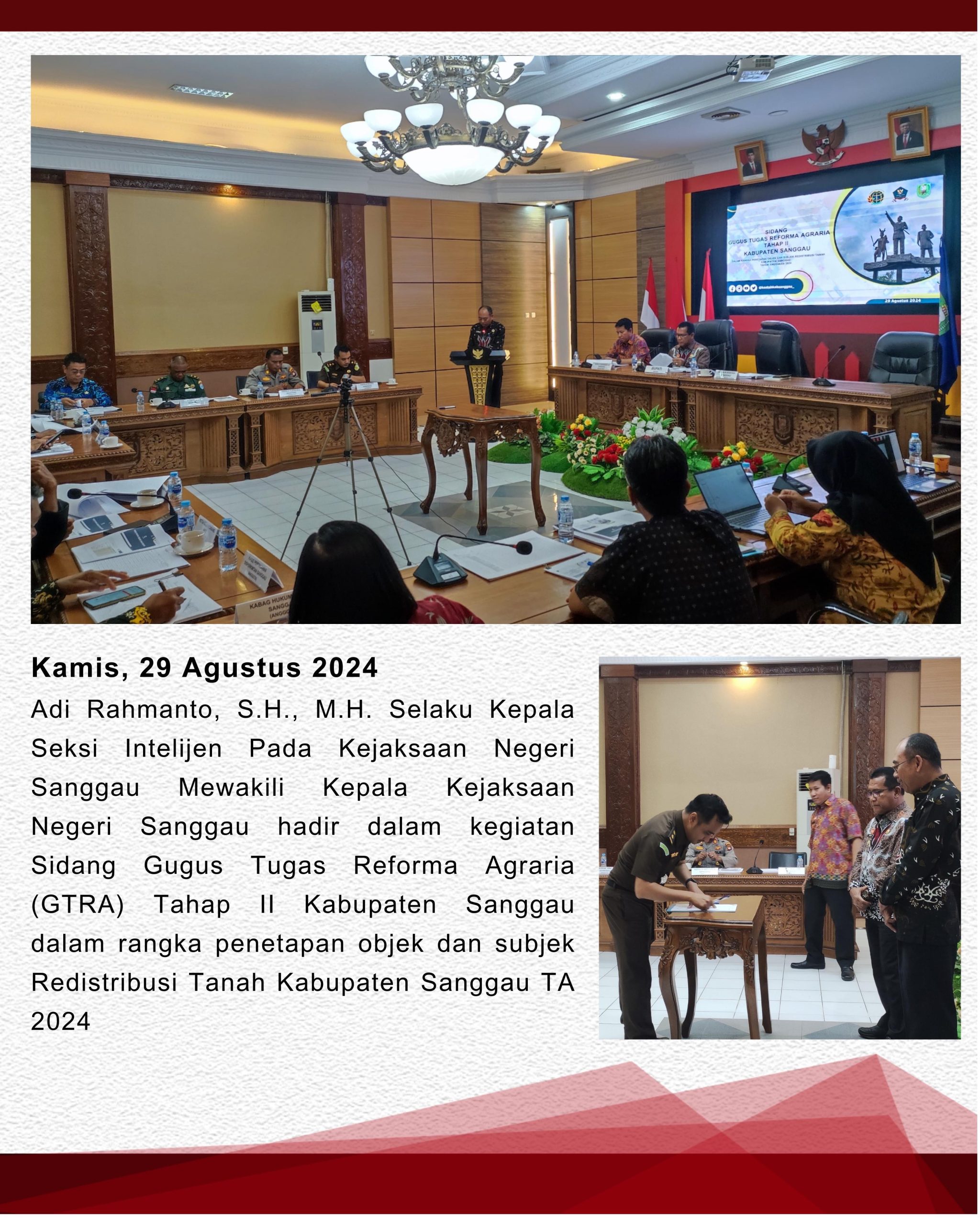 Kepala Kejaksaan Negeri Sanggau yang diwakili Kepala Seksi Intelijen Adi Rahmanto, S.H., M.H., menghadiri Sidang Gugus Tugas Reforma Agraria Tahap II Kab. Sanggau dalam rangka penetapan Objek dan Subjek Redistribusi Tanah Kab. Sanggau TA 2024.