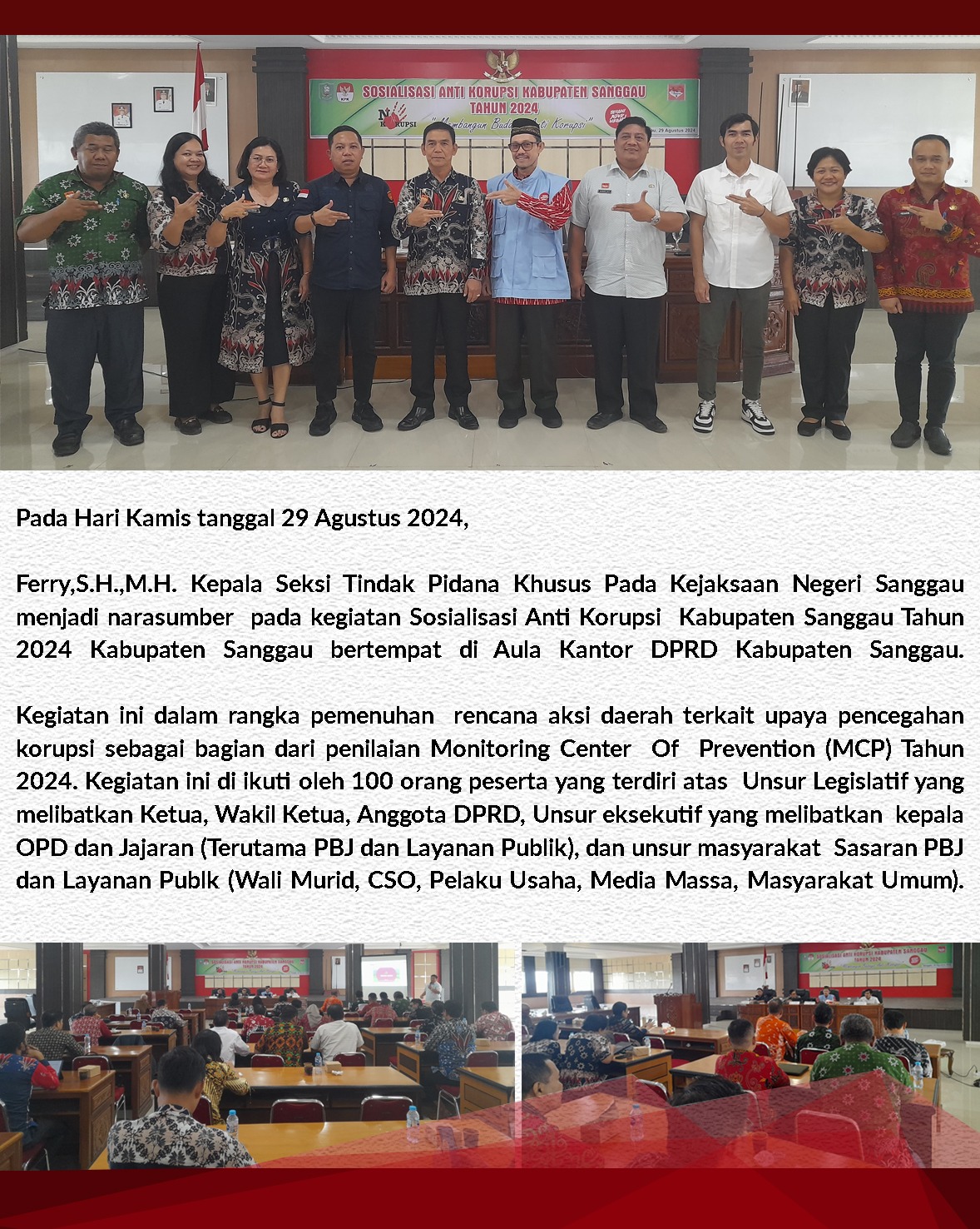 Kamis, 29 Agustus 2024, Kepala Seksi Tindak Pidana Khusus Kejaksaan Negeri Snaggau Ferry, S.H., M.H., menjadi narasumber pada kegiatan sosialisasi anti korupsi di aula kantor DPRD Kab. Sanggau.